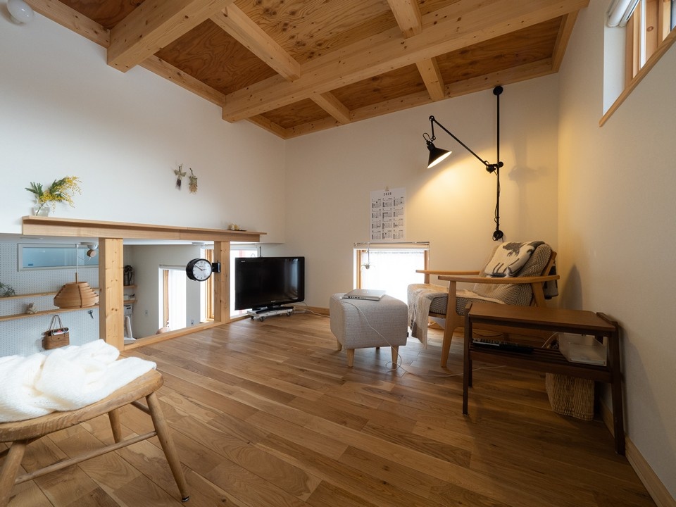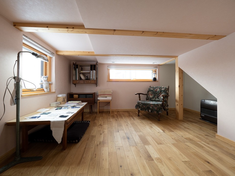 リビング続きに設けた作業部屋は、上階が中2階になっていて、天井の低い造りです。淡いピンクの壁紙とナラの無垢材をつかったフロアで居心地のよい空間に仕上がっています。