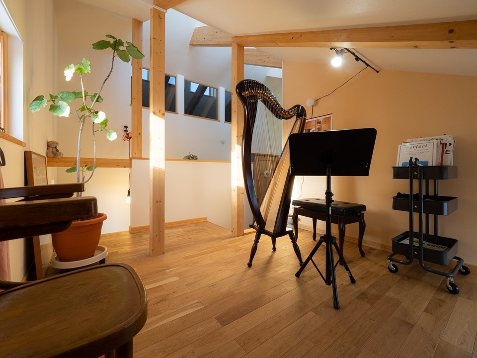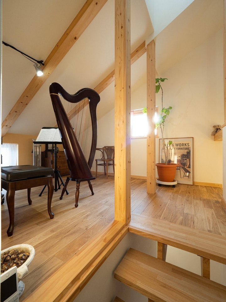 2階ホールから階段を数段上がったところにあるロフトは、ハープの練習スペース。窓からの眺めの良さもお気に入りです。