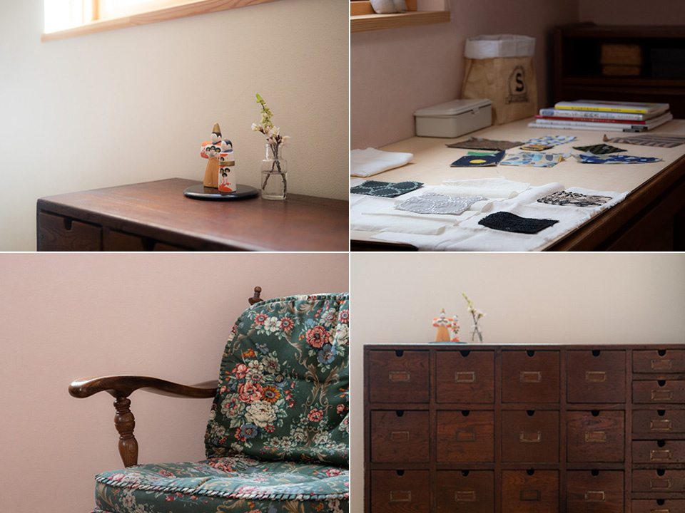 リビングと作業部屋にある薬箪笥やリラックスチェア、季節の小物など