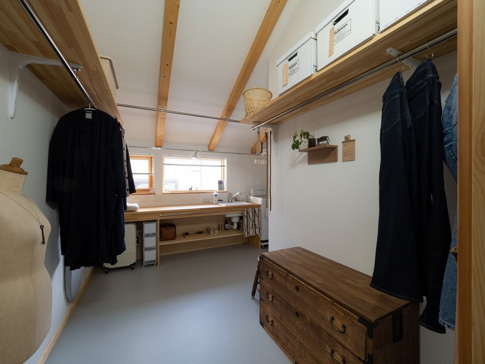 身支度や洗濯仕事をここで完結したかったというAさん。予洗いや、アイロンがけ、洋服を畳むなどの作業が1カ所で出来る、シンク付きの作業台も造作によるものです。ここにも実験用のシンクを採用しています。