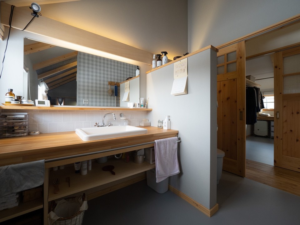 Aさん「中2階には、開放感を出すために腰壁や柵をつくっていません。お子さんのいる家庭では出来ないようなことも、一人だから出来たと思っています。天井の低い作業部屋や、大きな洗濯室なども、家族分の居室が必要な場合は難しかったでしょう」。浴室を設けない、洗面トイレが一体型なども、単身ならではのチョイス。どちらも使い勝手がよさそうです。