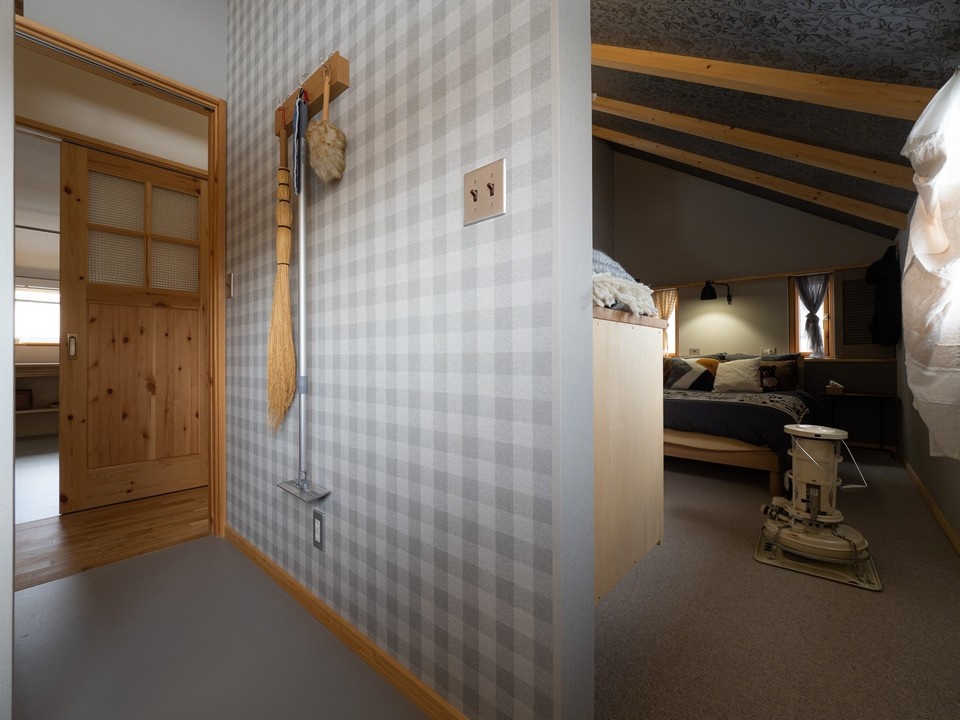 屋根勾配を活かした2階主寝室は、特にクロス選びにこだわった空間。飽きのこないよう、壁は無地にして、天井に柄をもってきました。植物を模したウィリアム・モリスの図案です。