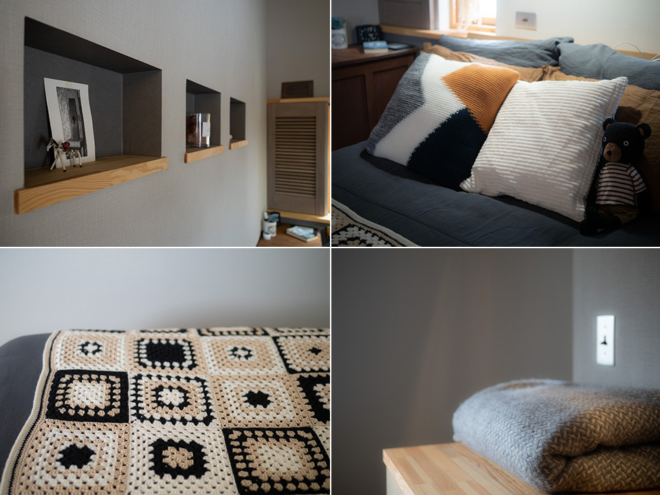 寝室の反対側には間接照明を付けた収納ボードを造作。窓側の通路を通って洗面トイレ室に入ります。床には100%ウールのじゅうたんを敷き詰めています。夏でも足触りがよく快適なのだそう。