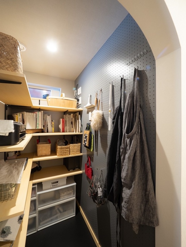 ボイラー室の手前にあるパントリー。グレーに塗った有孔ボードや下がり壁で、インテリア性が高く使い勝手の良い収納スペースになりました。