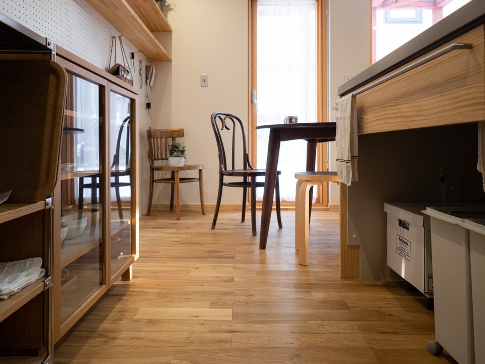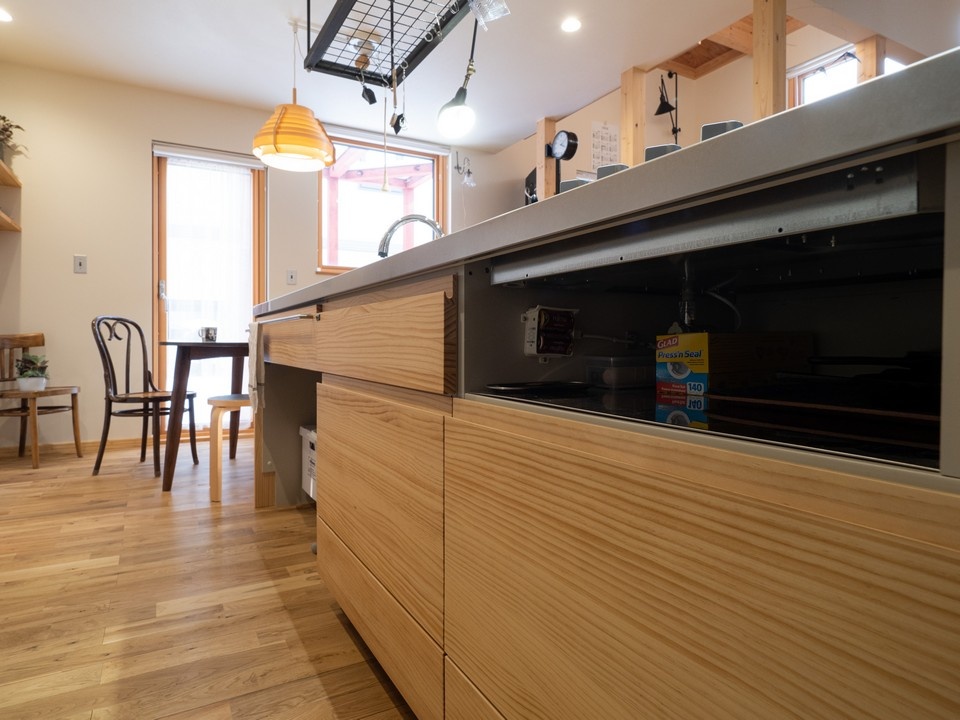 キッチンには面材に天然木を使ったウッドワンのシステムキッチンを採用しました。シンク下には出し入れが便利な移動式のごみ箱が収まっています。