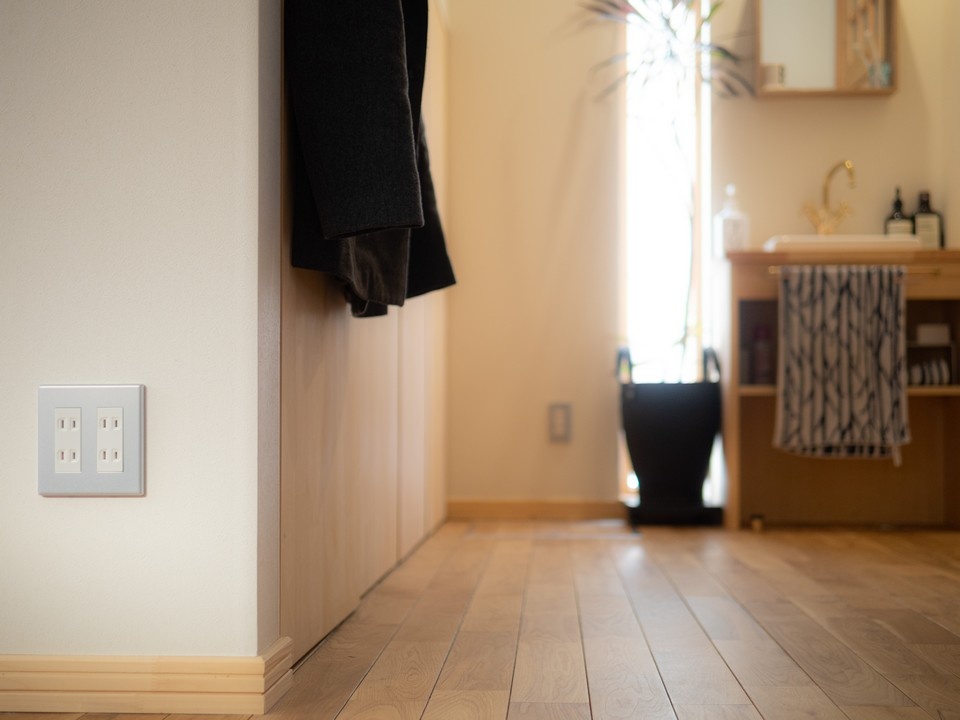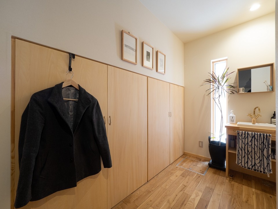 玄関に入って右手には、大型のクローゼットと手洗いがあります。クローゼットの扉や手洗いは大工さんの造作によるもの。特に扉は、枠から均等に隙間を残した、凝ったデザインになっています。