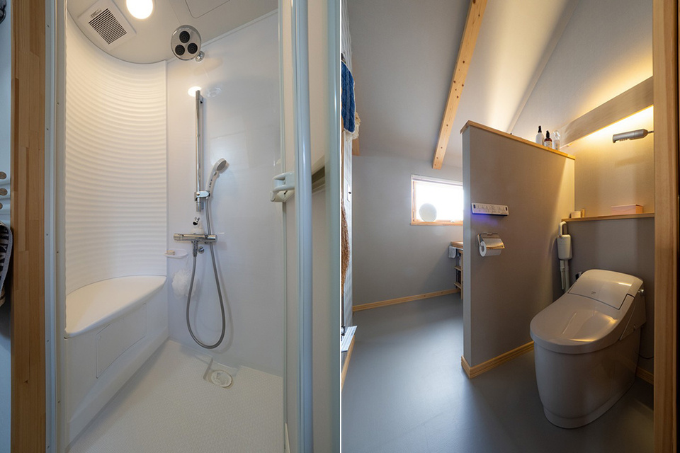左/2階洗濯室奥にあるシャワー室。お風呂に入りたい時は、親世帯の浴室を使っているそう。シャワーユニットは天井まで手が届き、掃除もしやすいと好評です。