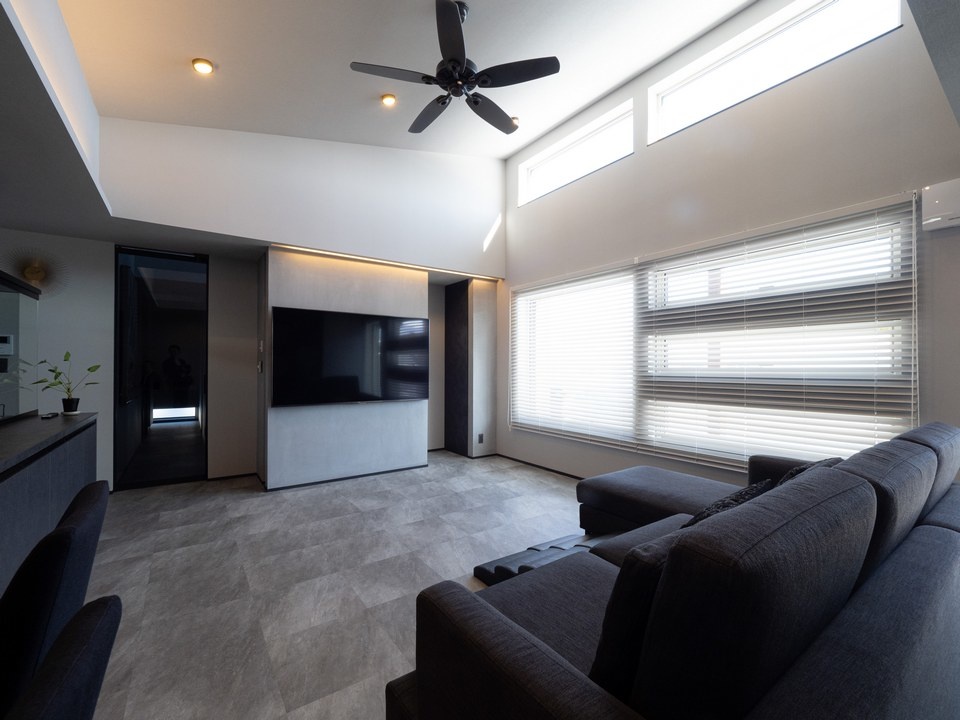 ゆるやかな勾配天井のリビング。モノトーンでコーディネートされた大人の空間です。存在感のある黒いソファの正面には大型の壁掛けテレビがあり、ホテルの一室に居るかのような贅沢感を味わえます。