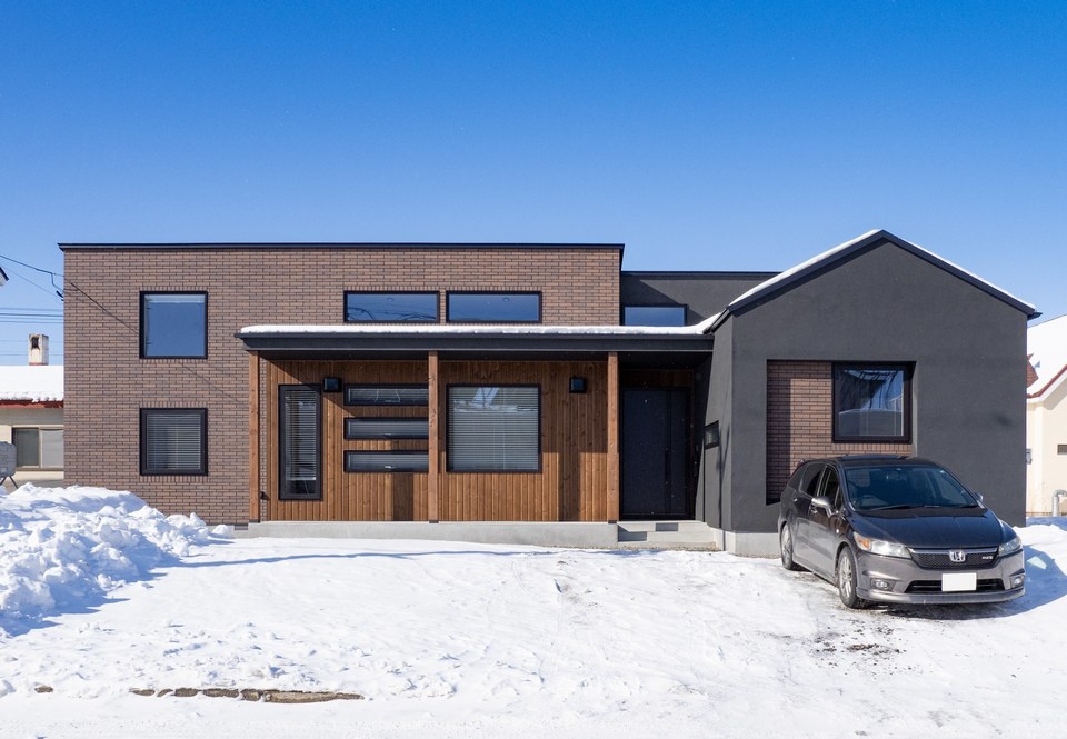2019年11月完成のG邸は緩やかな片流れ屋根と三角屋根を組み合わせた平屋建て。レンガ調タイルとモルタル壁をバランスよく配し、ナチュラルな木でアクセントをつけたインダストリアル系のモダンデザインが印象的です。