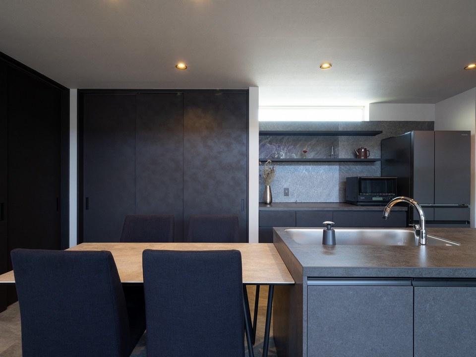 「生活感を出したくない」という奥様の意向によりキッチン収納は中身が見えません。ロータイプの食器棚はキッチンと同じ黒のセラミック天板を使って造作したオリジナルです。その左側に天井までの高さがある大型パントリーを設置しています。