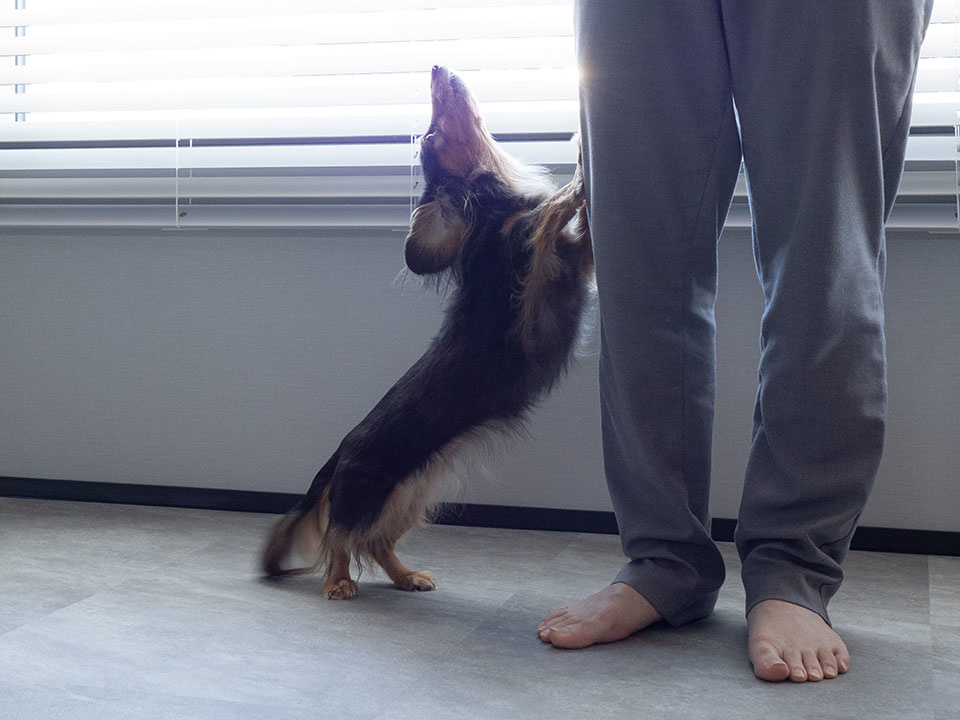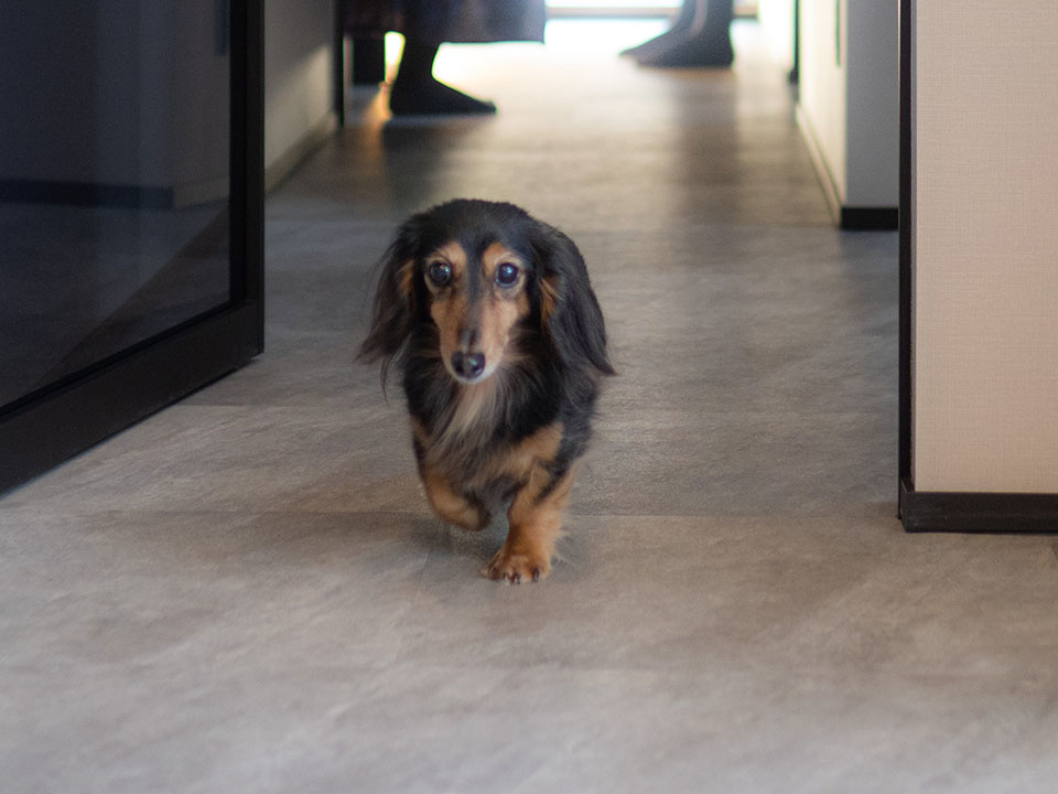 床はフローリングにする予定でしたが、ミニチュアダックスフンドの“カレンちゃん”が滑りにくいようグレーの石目調タイルを貼ることに。カレンちゃんのトイレはテレビを設置した壁の裏側に設けています。
