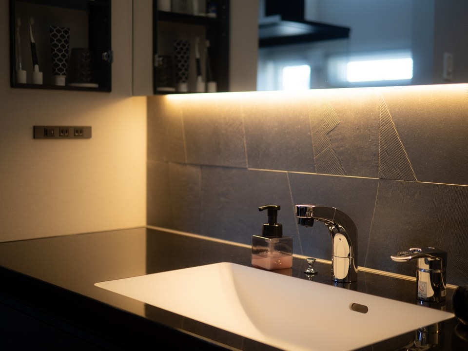 全面鏡貼りの黒の洗面台を造作した気品のある洗面スペース。鏡の下に設置された間接照明が映し出す石目調タイルの陰影がとてもキレイです。「清潔感のある白の方がいいのかな、と迷いましたが、居室との一体感を重視して黒を選びました(奥様)」。