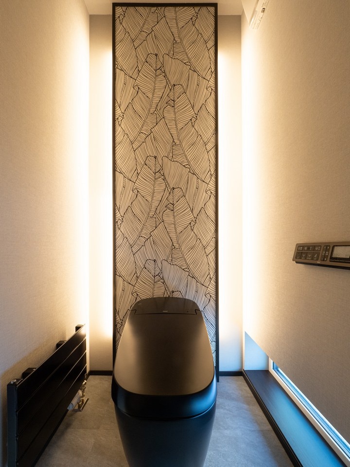 木の葉をモチーフにしたクロスを使った間接照明がお洒落なL字型のトイレ。入り口からはコーナーに取り付けた黒のタンクしか見えないので、そこがトイレであることさえ感じさせません。