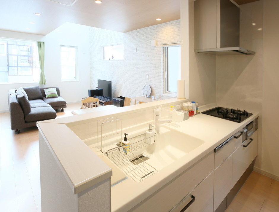 オープンタイプの対面キッチンからは、LDが見渡せる造り。ホワイトで統一し、清潔感あふれる仕上がりになりました。