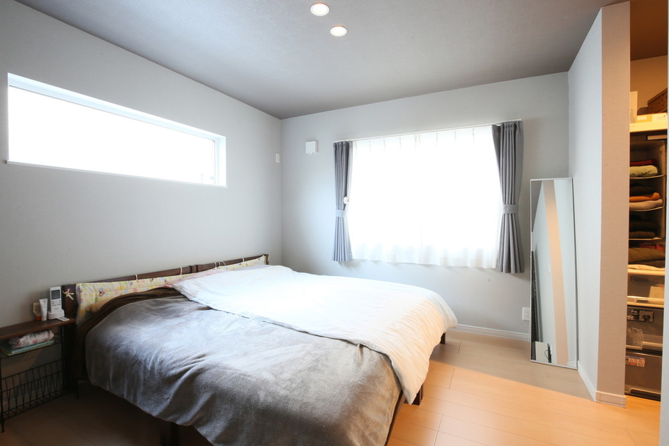 主寝室にはクローゼットに加え、ウォークインクローゼットも設けています。淡いグレーの壁紙で落ち着いた雰囲気に仕上がりました。このほか、2階には将来子ども部屋として使えるよう、個室が2部屋あります。