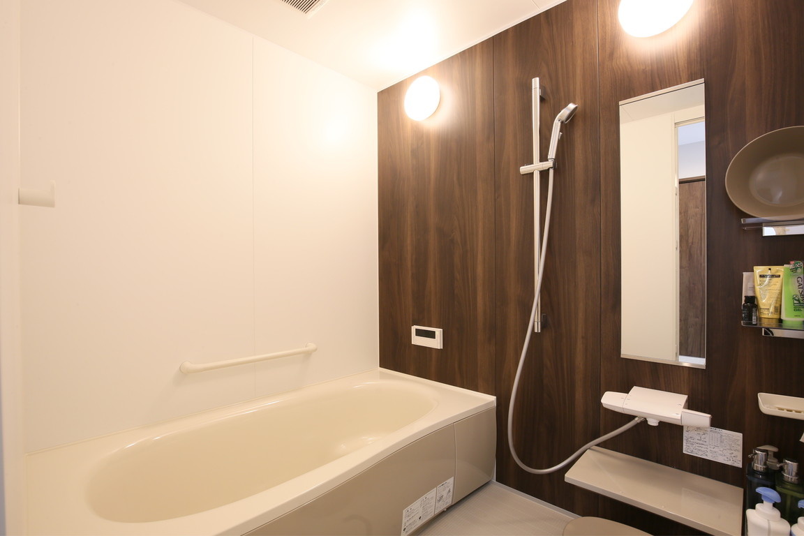 木目調のアクセントパネルがおしゃれなお風呂は通常より大きめの1.25坪のタイプ。ゆったりと入浴したいというKさんのこだわりポイントでした。