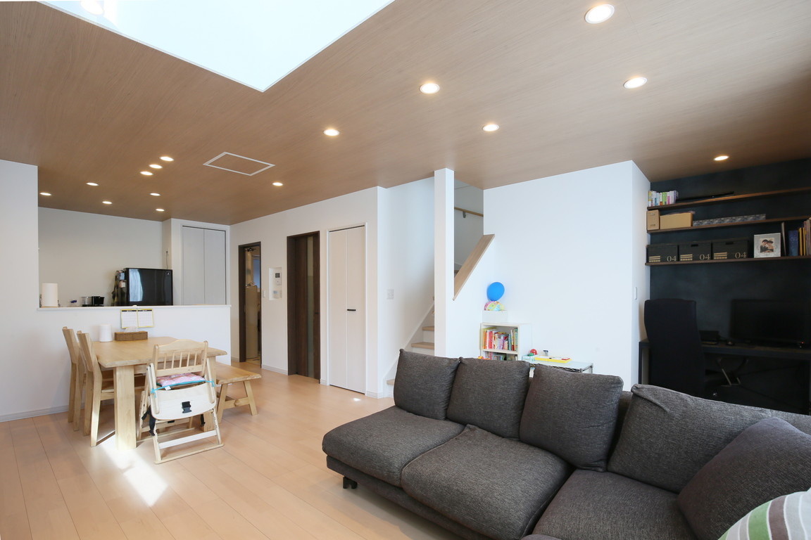 吹き抜けを設けた1階LDK。吹き抜け窓から日差しを採り込む明るい空間に仕上がりました。ホワイト・レンガのアクセントクロスや、天井に使った木目調のクロスでインテリア性にもこだわりました。照明はダウンライトのみで、スッキリ広々とした印象です。
