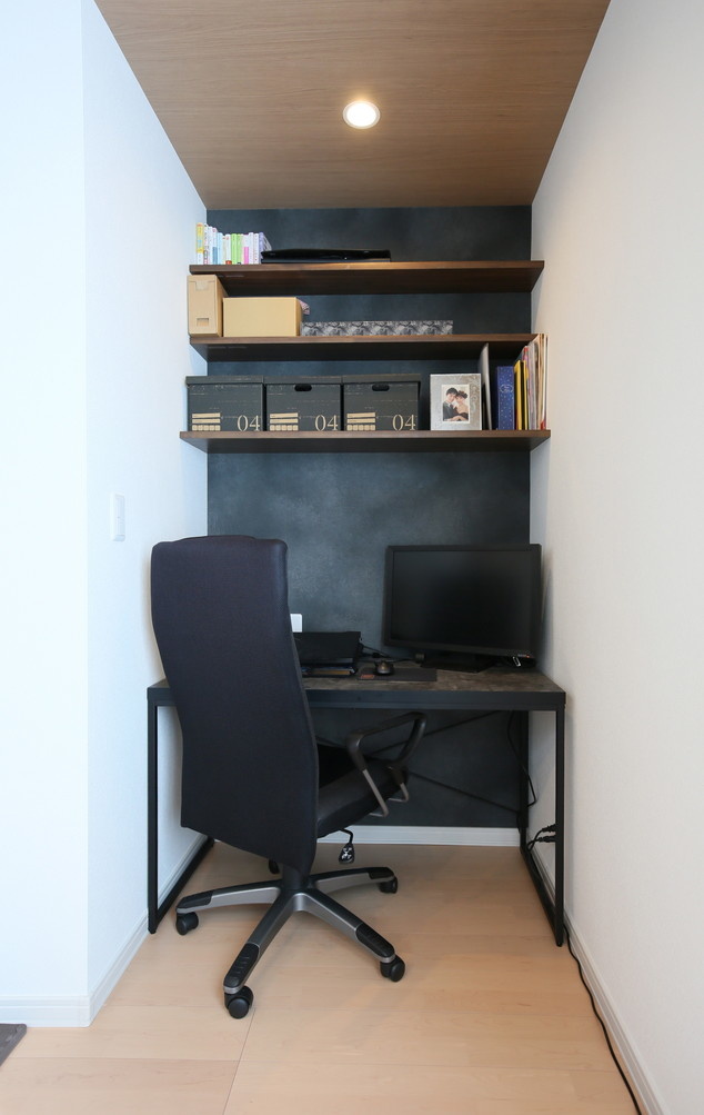 リビング脇につくった書斎スペースは、ブラック・コンクリート風の壁紙を使い、アイアン・デスクや黒のチェアで男前に仕上がりました。少し奥まって配置することで、落ち着いて作業ができる空間になっています。
