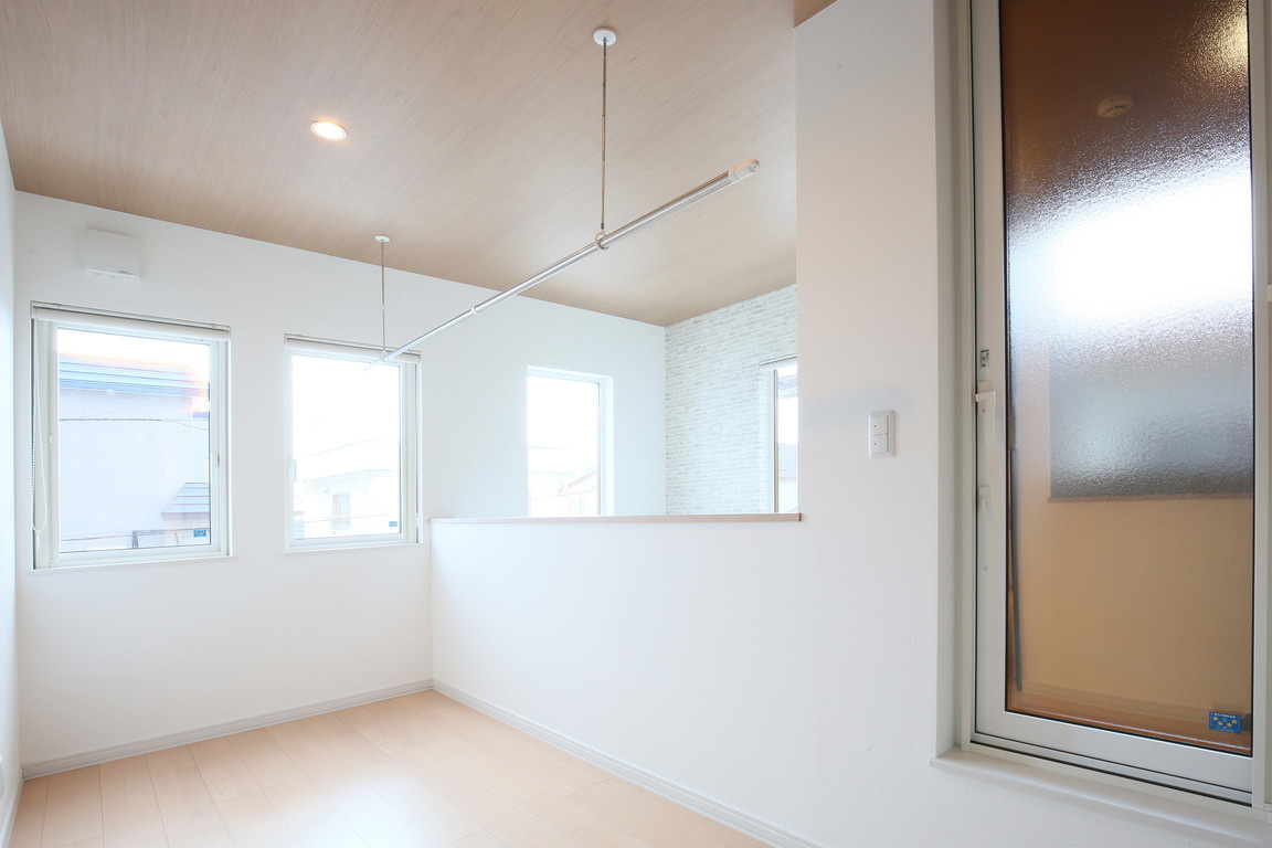 約3畳大の2階ホールは吹き抜けに面した明るい空間。物干しポールを設けて、洗濯物干しに使っています。1階からの暖気で、洗濯物がすぐに乾きます。
