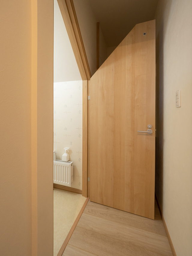 2階のトイレはニッチのスペースを活用。トイレの扉は、建具屋さんが天井の勾配に合わせて造作しています。