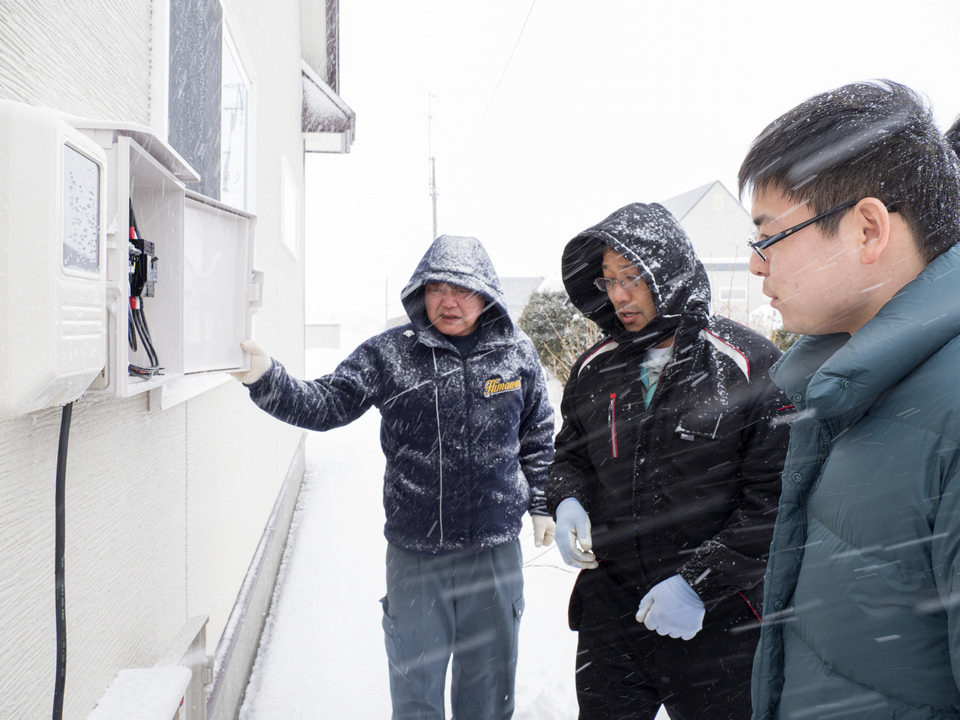 そこでS邸で導入したのが「LPガス発電機による自家発電」です。写真は建て主さんに、装置の操作方法を赤坂社長と設備会社の専門家がお伝えしている場面です。