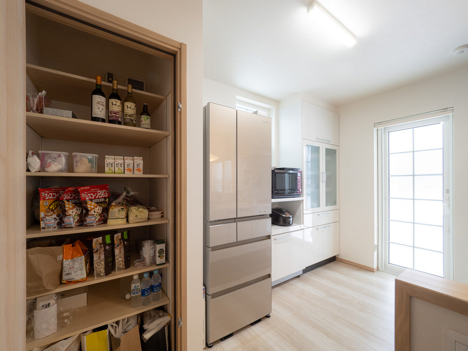 そこで、外気を直接取り入れて温度を下げることができる食品庫(パントリー)をキッチンの近くに設置すると大変便利です。十勝ワインも入っていました。食品庫内に温度センサーがついているので、適度に外気を取り入れて食品保存に適した温度を維持できます。保存食などをストックしやすいので、もし自然災害などが発生した場合も、あわてて買い出しに行く必要がなくなります。