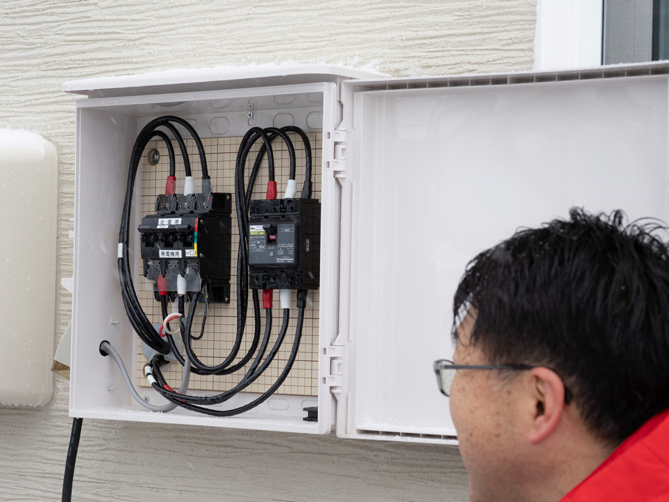 停電が発生すると、住宅の外壁に設置してある「nito切り替え開閉器」で、電力会社からの電源ではなく、発電機による自家発電を使用するようにワンタッチで切り替えを行います。