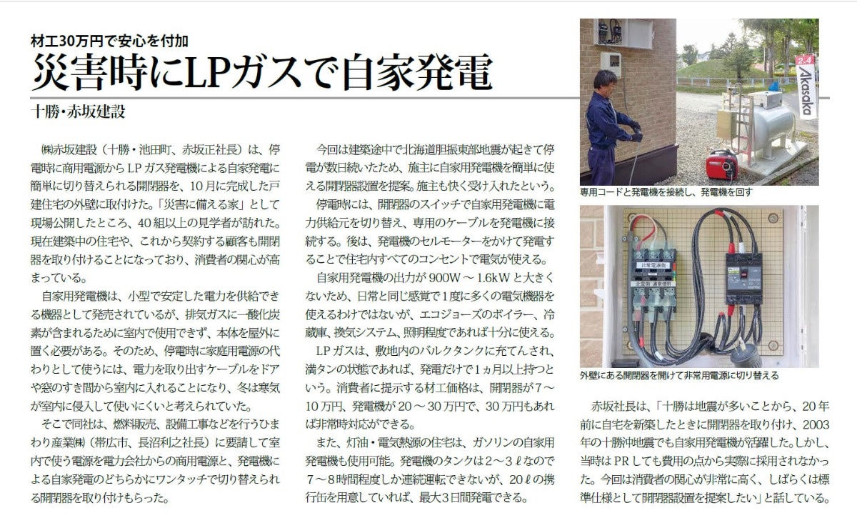 株式会社赤坂建設(十勝・池田町、赤坂正社長)は、停電時に商用電源からLP ガス発電機による自家発電に簡単に切り替えられる開閉器を、10 月に完成した戸建住宅の外壁に取付けた。「災害に備える家」として現場公開したところ、40 組以上の見学者が訪れた。(中略)