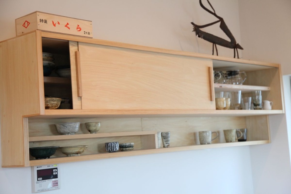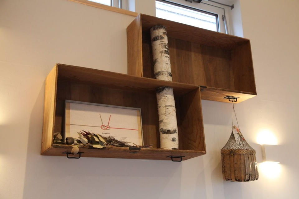 アンティークな家具やナチュラルな建具など、気になるものがいろいろあるのも松本さんの狙い。この写真は白樺をあしらった装飾棚。後述しますが「白樺」は重要キーワードです。