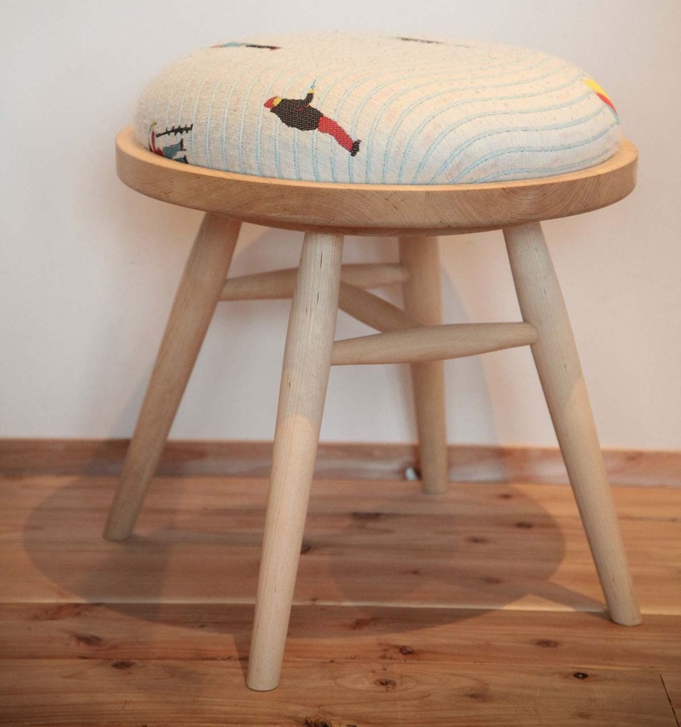 北海道・旭川の白樺を、ローカルベンチャーで自立を目指していることで有名な岡山県・西粟倉村の家具職人にお願いしてスツールにしてもらいました。座面にはわかさぎ釣りをしている人の絵が描かれていますが、長年使用して布が薄れていくと別の絵柄が見えてくる、そして座面を取り外すとちゃぶ台にもなるスツールです。