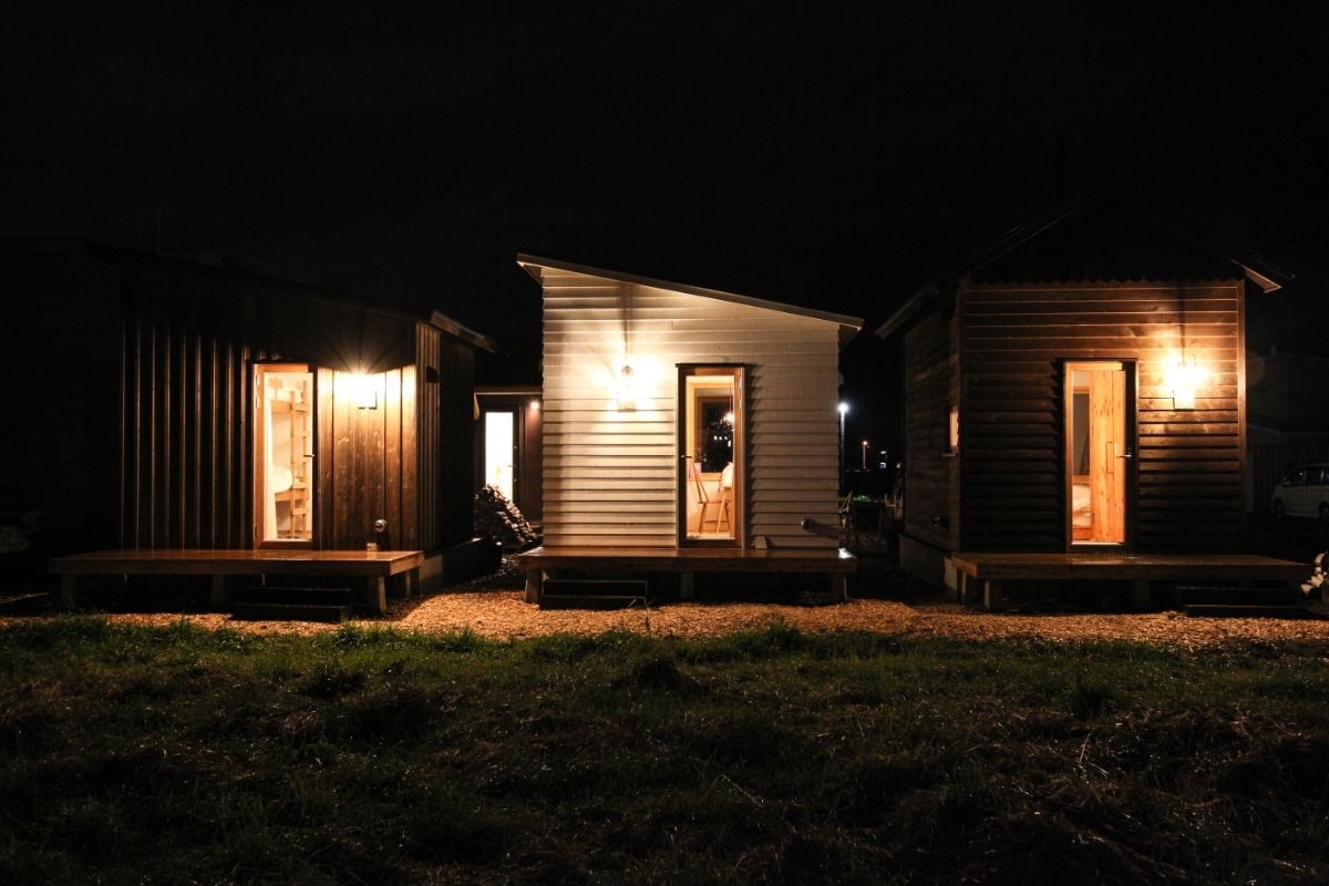 3棟の小さなタイニーハウスがホテル宿泊用の建物です。タイニーハウスはアメリカ発祥で「小さな家」の意味。2000年頃から、小さな家を建て、モノを持ちすぎずシンプルに暮らす生き方、価値観が評価されるようになり、世界的なブームになっています。