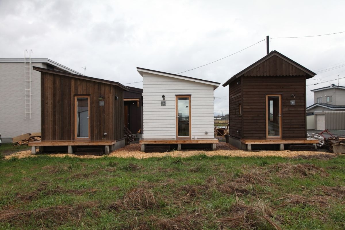 2019年秋にオープンした「旭川公園ゲストハウス」は北海道旭川市永山1条24丁目2の約480平方メートルの敷地内にあります。ホテルですが、日中はカフェとしても営業しています。右の建物がコモン棟で正面にある3棟の小さな小屋(タイニーハウス)が宿泊棟です。