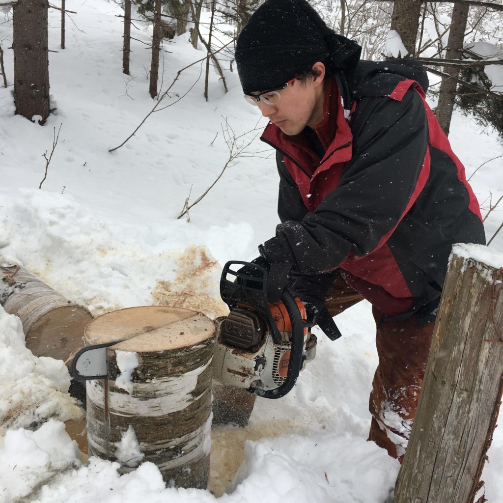 「旭川公園ゲストハウス」の近くにある裏山「突哨(とっしょう)山」の所有者で、山に負担をかけない、森を守り育てる「自伐型林業」を行っている旭川の木こり:清水省吾さんとの連携で「顔の見える」薪も確保。