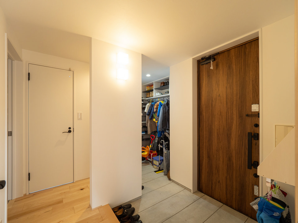 家族が過ごす一日の流れを把握した老川さんは、玄関からの動線を2つに分けました。パーティーションで2つの入口に分けられています。ひとつは、玄関ホールから直接リビングへ。