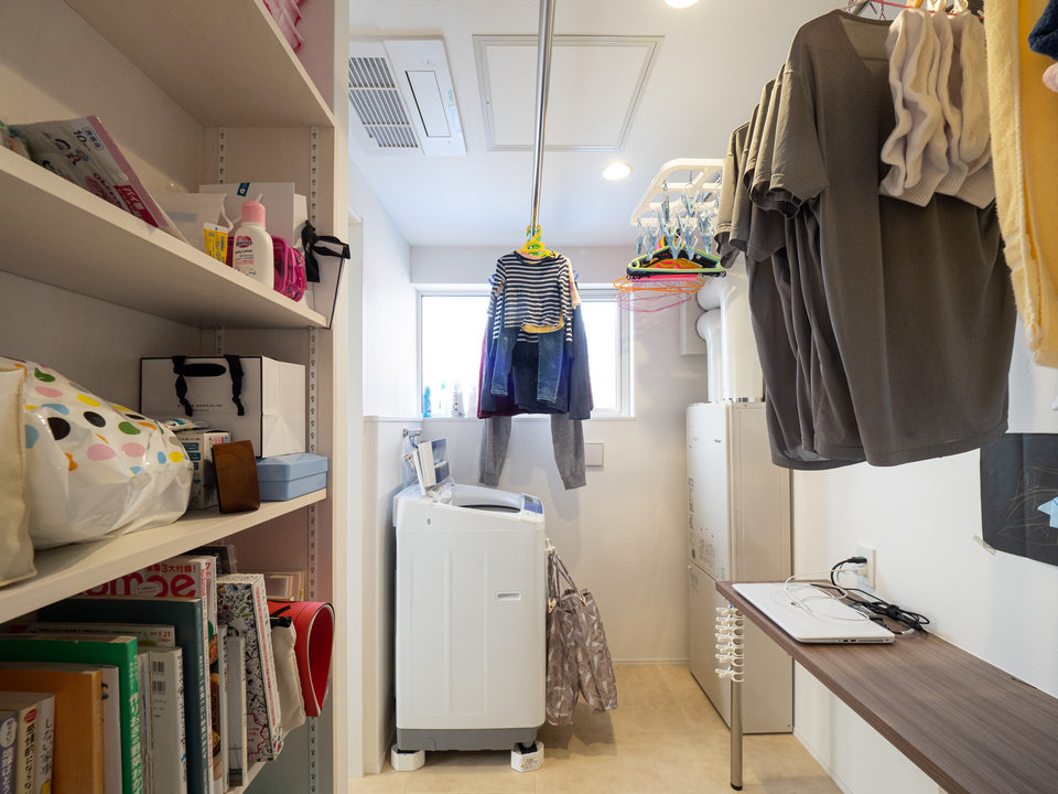 キッチンに隣接した家事室は奥さまのお気に入りです。「前の家では、1階で洗濯したものを2階へ行って干すのがすごく面倒でした。それをオイちゃんに話したら、ここだけですべての洗濯作業ができる部屋を造ってくれたんです」。家事の合間にパソコンなどができる、奥さま専用のカウンターも設けました。