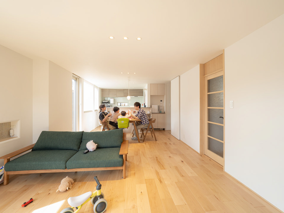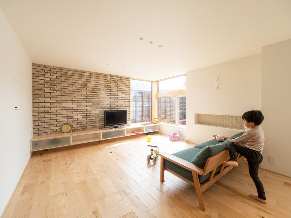 着工前に生まれた弟さんもいまは1歳に。Mさん邸ではLDKに床暖房を採用、お子さんたちの手足が冷えることもなく安心して暮らしています。