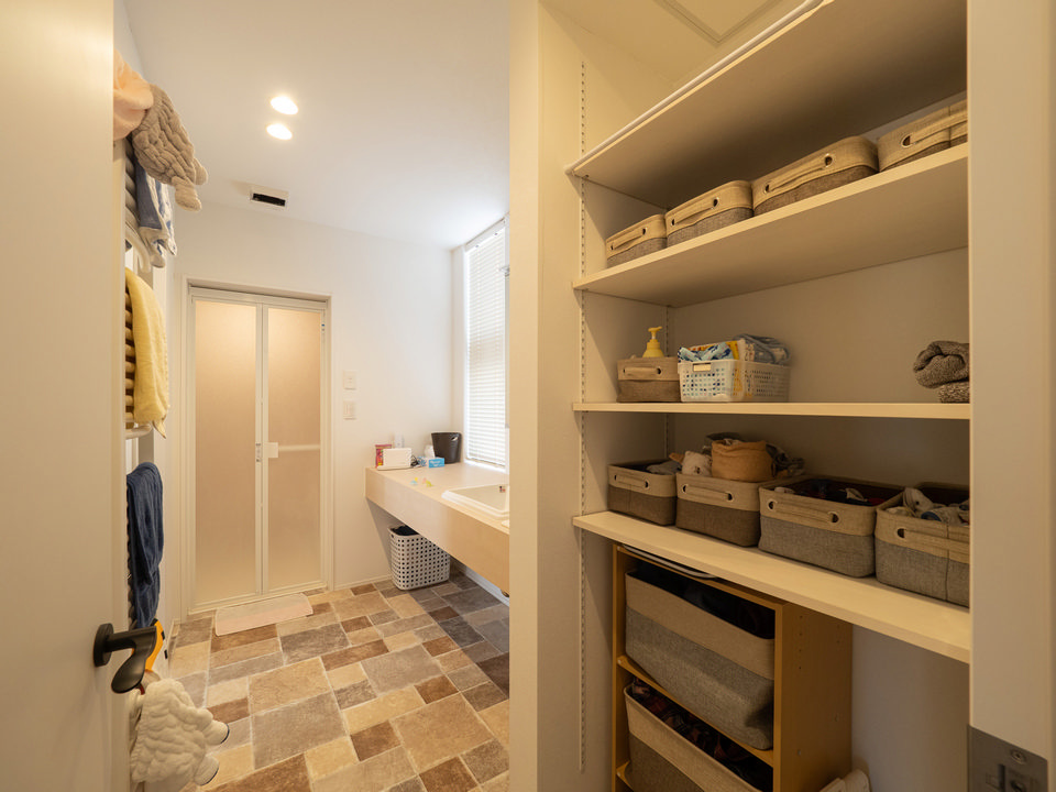 もうひとつは家族用で、シューズクローゼット側から入ります。トイレ、洗面室・浴室と水回りが直線に続き、洗面室にあるもうひとつのドアを開ければすぐ階段で2階へ上れます。