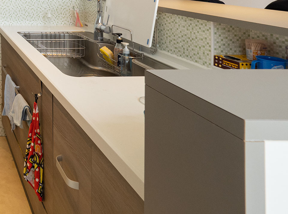 家事室の隣はキッチンコーナー。平日は材料を切ったり洗ったりする作業が多いので、リビングにいる子どもたちが見える対面キッチンに流しを設置。お皿に料理を取り分けたりと、ゆとりがあって使いやすさも抜群です。ガスコンロは壁側のカウンターに設けました。「サッと後ろを向いて炒めものができたりするので、無駄な動きがないんですよね」。奥さまも働きに出ているので、調理は週末にまとめてやることが多いそうです。