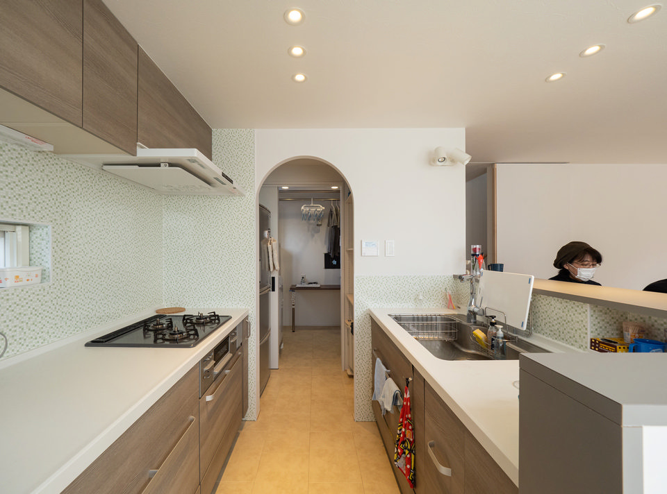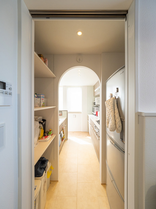 綿密な打ち合わせで実現したものもあれば、老川さんがご夫妻のライフスタイルや好みを察して造られたところもあります。例えば、キッチンと家事室の間にある出入り口。上部にアールをつけた形で「ここが可愛くて好きなんです。お願いしたわけでもないのに、なんで好みを知ってるの?という感じ」と奥さま。