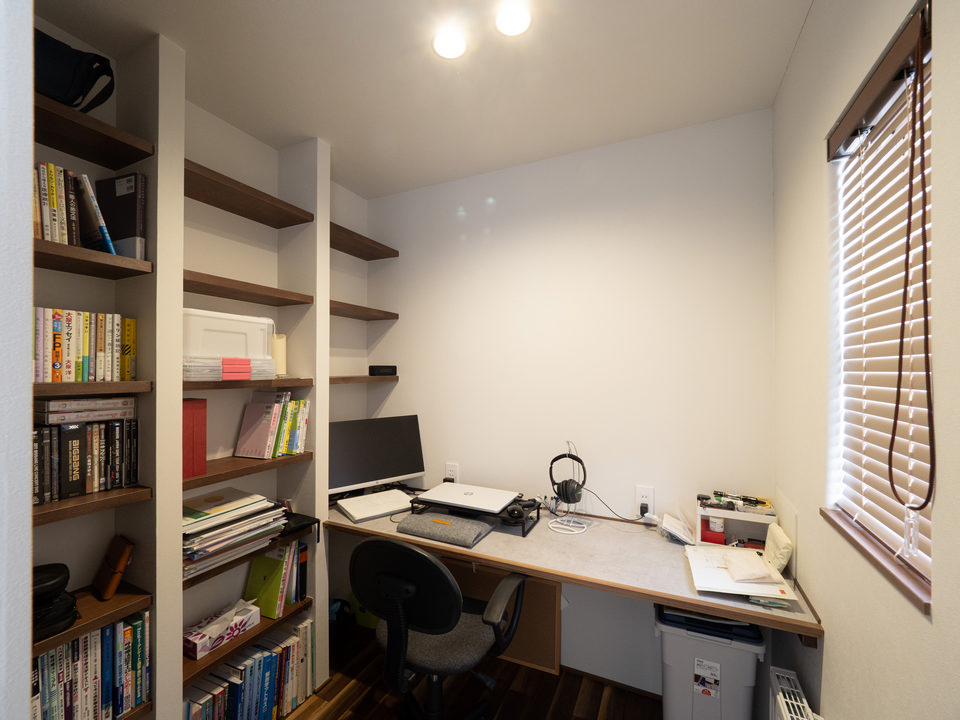 2階にあるご主人の書斎です。壁には本棚を造作。お仕事を家に持ち帰っても集中できる環境です。