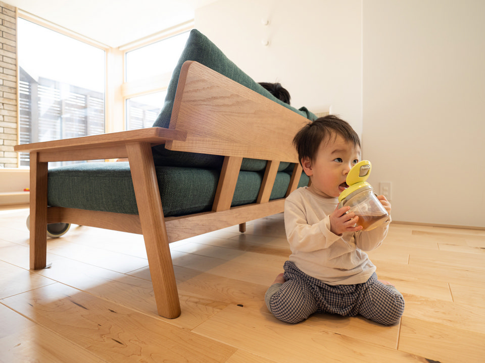 淡い色のメープル材を挽板(ひきいた)にしたフローリングは、無垢板と同じような足ざわりで家族のお気に入り。床暖房に対応し、表面を守る塗装を施しているのでワックス掛けも不要です。子どもが飲み物などをこぼしても、サッと拭けば済むのもうれしいところ。