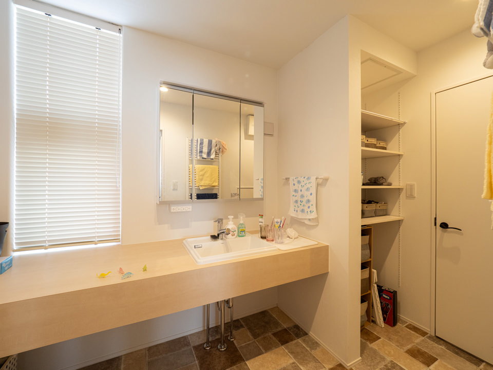 洗面台カウンターはシンプルで明るいトーン。水かかりの多い天板は、湿気に強くお手入れしやすい木目調のメラミンを使って造作しました。