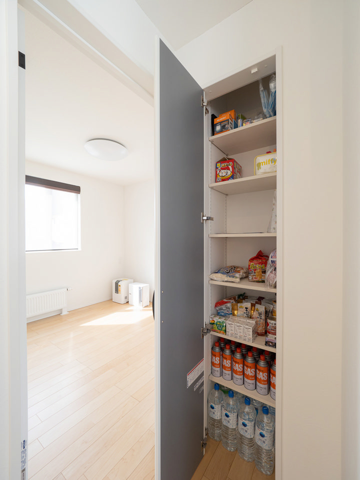 打ち合わせ中にちょうど北海道胆振東部地震があり、2階ホールに非常用品の備蓄庫を造りました。飲料水、食料品、カセットコンロ、ソーラー充電のミニライトなどまとめることで、探さなくても良くて安心ですね。