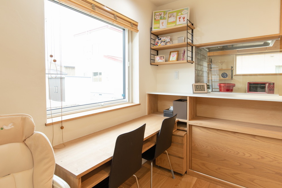 ダイニングの窓辺には便利な造作カウンターを設置。袖机やプリンター台などの収納家具もすべて大工さんの造作です。
