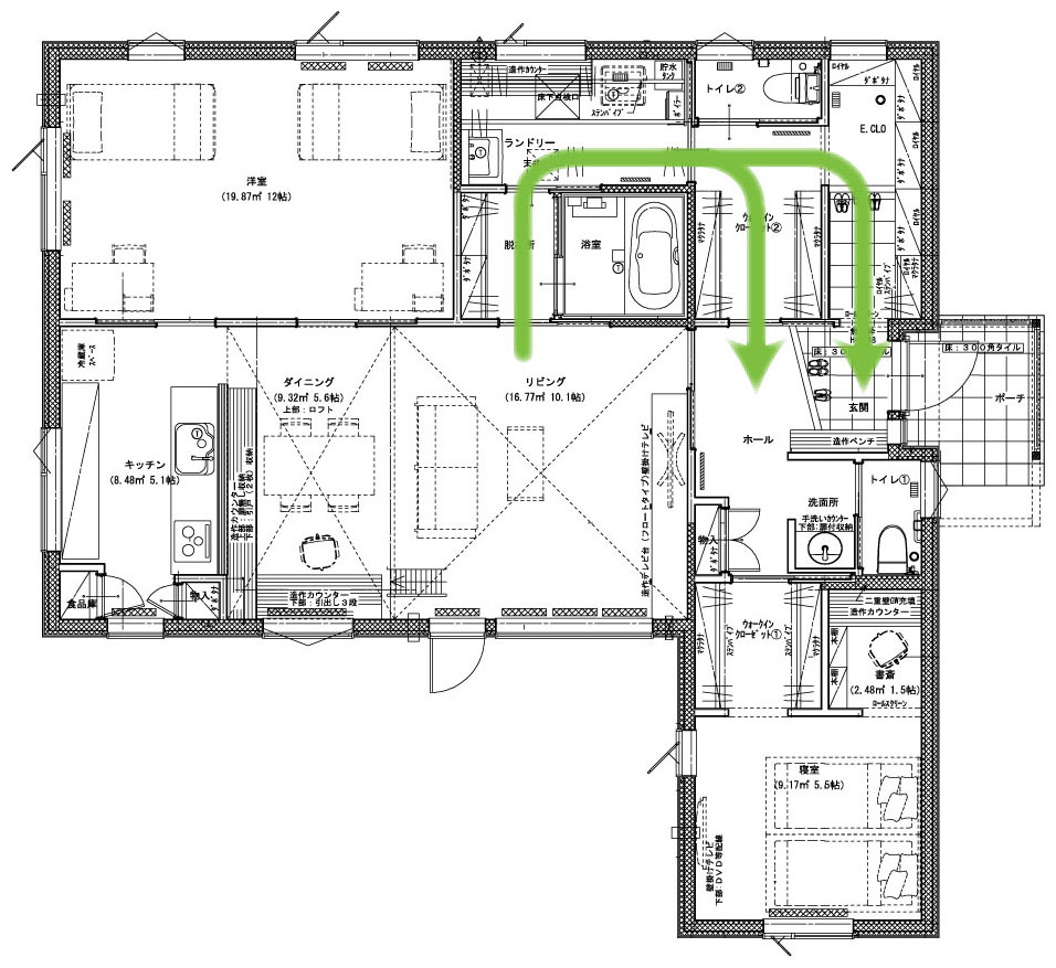 LDKから脱衣・浴室、ランドリールームへとつながる動線図