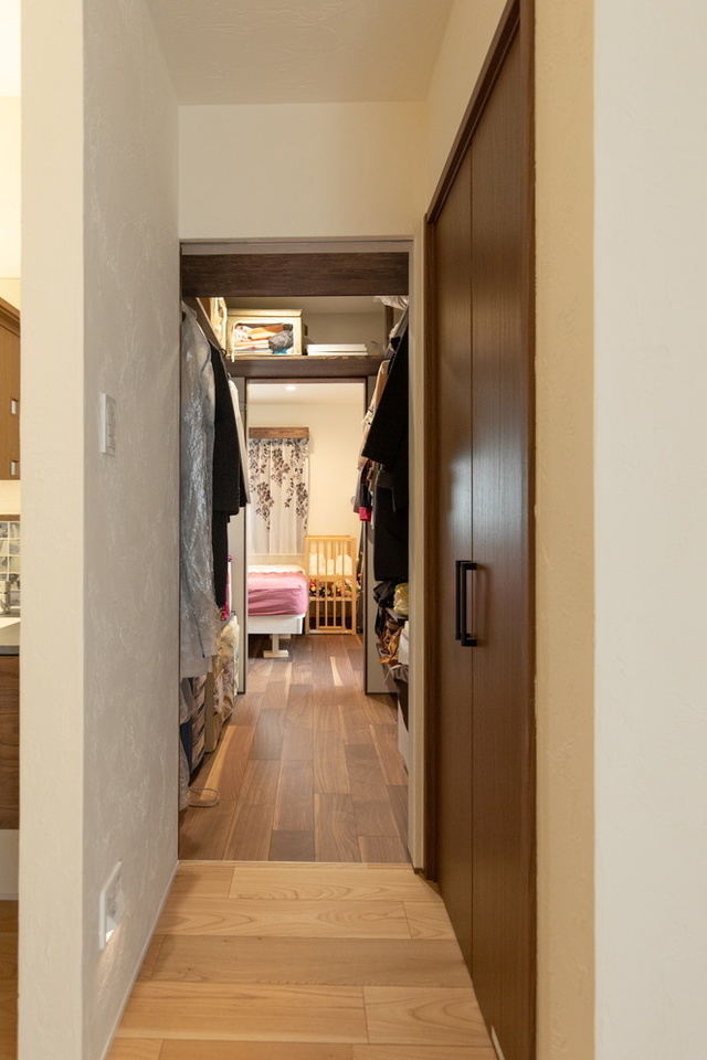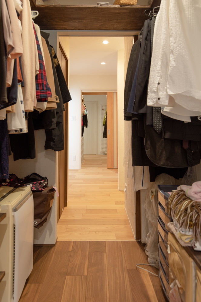 寝室につながるウォークスルークローゼット②にはご夫婦の洋服が収まっています。ホールを介して向こう側にウォークスルークローゼット①が見えます。