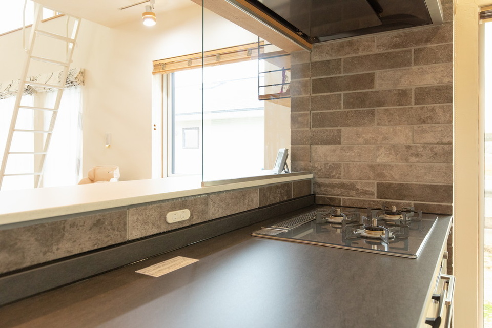 ガスレンジの壁面やワークトップ前の立ち上がり壁にはシックなタイルを使っています。