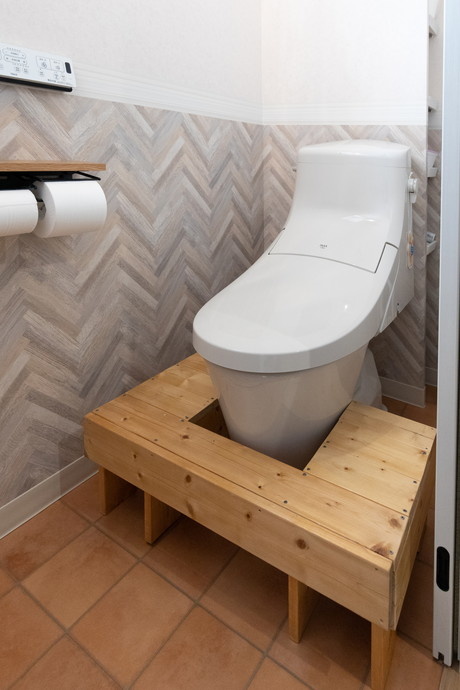 ランドリールーム横、ウォークインクローゼットに面した家族専用のトイレは、まだ小さいお子さんのために足台をつけてもらいました。