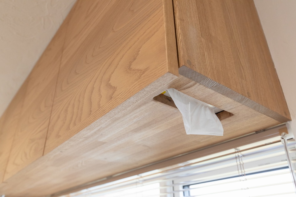 吊戸棚の右端にはティッシュペーパーが引き出せる口が付いています。ちょっとした汚れの拭き取りに重宝しているそう。