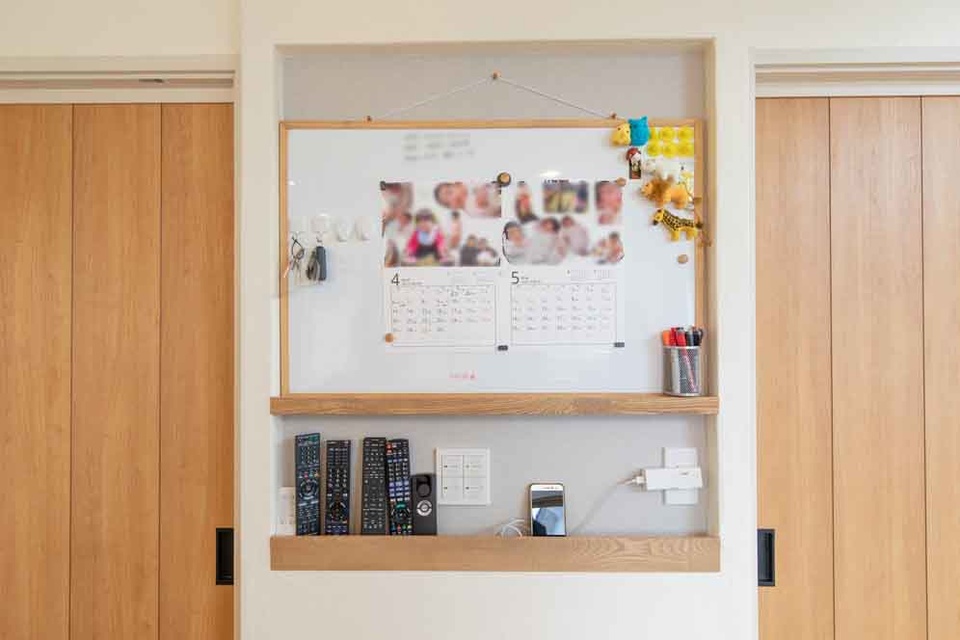 奥さまの希望でダイニング壁面のニッチには、ホワイトボードが置ける棚と、スマホの充電や家電のコントローラーが置けるコンセント付きラックを設置。お子さんの写真やカレンダーを飾ったり、必要なメモを書き込んだりするのに大活躍。家電のコントローラーも一カ所に集まっているので使いやすいそうです。